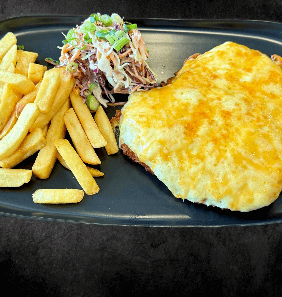 Deep fried chicken schnizel topped with bechamel sauce and cheddar cheese. Served with chunky chips and wholegrain mustard slaw.
